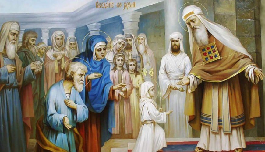 По преданию, первосвященник Захария встретил трёхлетнюю Марию и ввёл её в самое святое место храма, куда обычно входил только первосвященник. Так было явлено её особое предназначение и глубокая духовная связь с Богом.