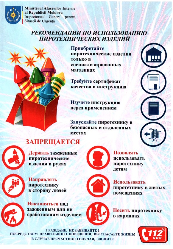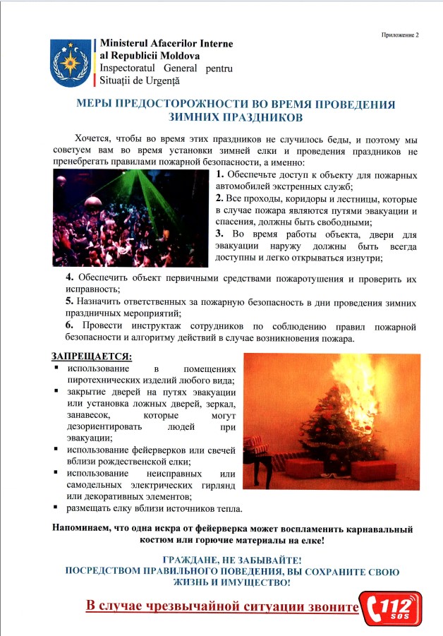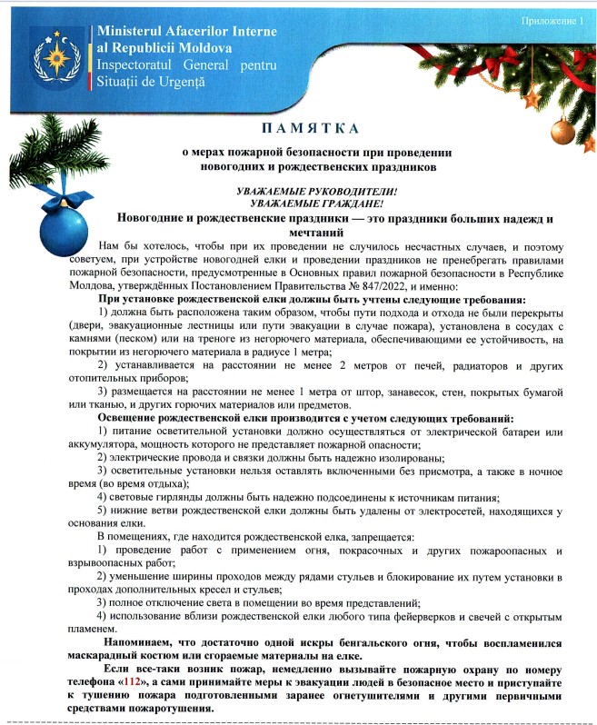 В период новогодних праздников, при установке новогодних ёлок и проведении праздничных мероприятий, настоятельно просим строго соблюдать требования пожарной безопасности, предусмотренные Основными правилами пожарной безопасности в Республике Молдова, утверждёнными Постановлением Правительства № 847/2022.