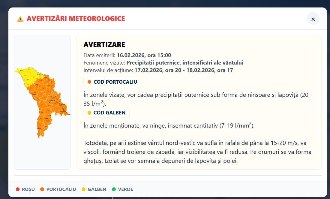 🟠На большей части территории Молдовы объявили оранжевый код метеопасности, действующий в период с 17 февраля 20:00 по 18 февраля 17:00.
