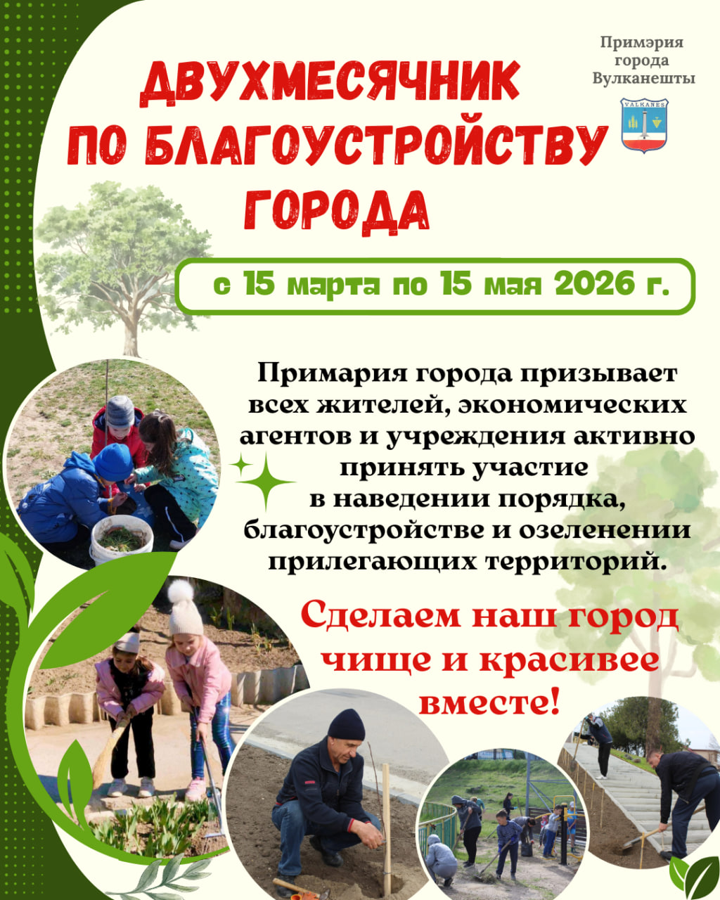 Согласно распоряжению примара, с 15 марта по 15 мая на территории города объявлен двухмесячник по благоустройству, санитарной очистке и озеленению. Призываем всех жителей, экономических агентов и государственные учреждения принять активное участие!
