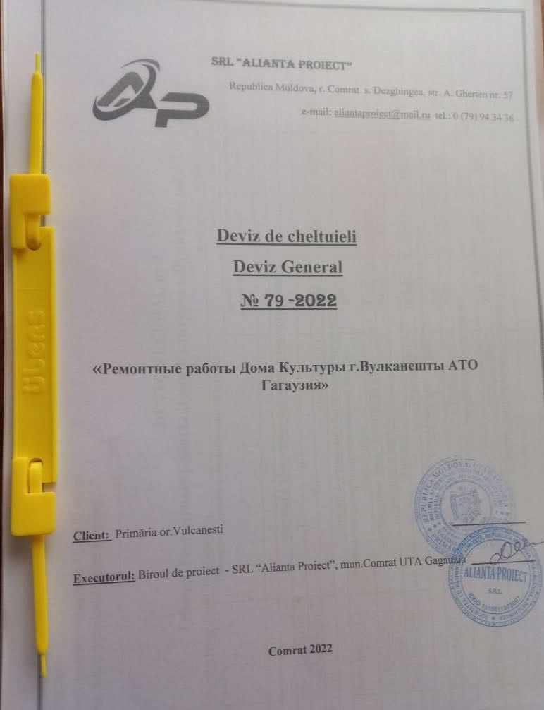 Примария города Вулканешты подала заявку и полный пакет документов (проектно-сметная документация, технический проект, отчет проверки) на участие во II этапе по полной реконструкции Дома культуры.