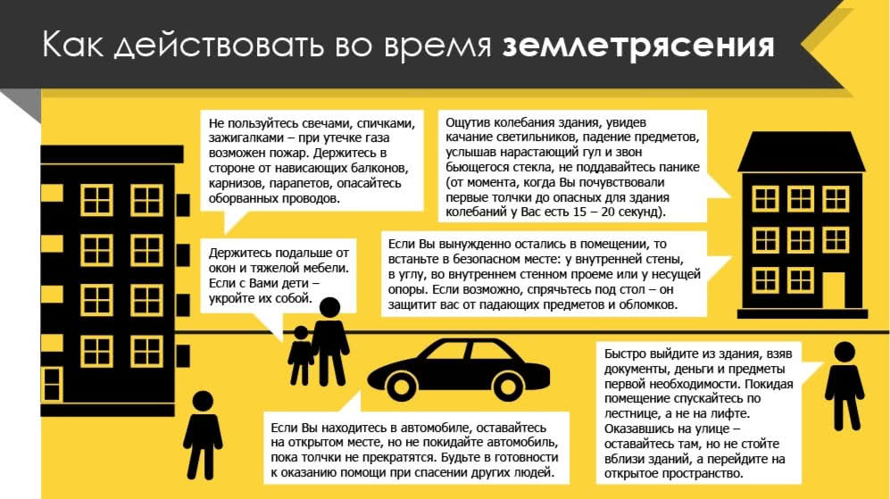 Во время толчков не входите в здания и не бегайте вокруг них. Лучше всего оставаться на открытом месте, подальше от зданий и линий электропередач. Если вы все же оказались рядом с высоким зданием, встаньте в дверной проем — это обезопасит вас от падающих обломков стекол, балконов, карнизов и парапетов.