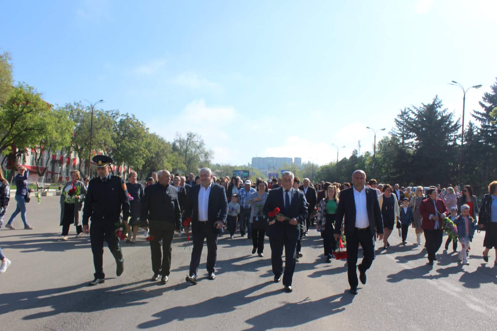 Участники марша, школьники, рабочие и пенсионеры прошли от городской площади к памятнику погибшим в Великой отечественной войне, где возложили венки и цветы. Также в городе состоялась акция «Бессмертный полк» — взрослые и дети несли фотографии своих дедов и прадедов — участников ВОВ и героев освободителей города.