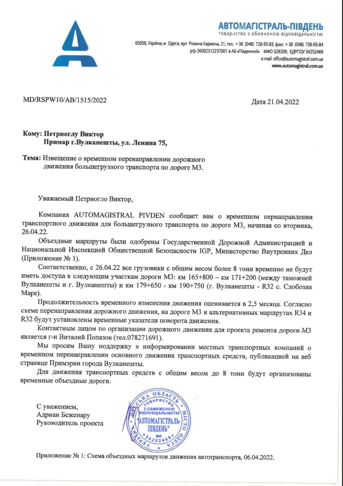 Уважаемые жители г. Вулканешты и участники дорожного движения компания Automagistral Pivden сообщает о том, что со вторника, 26.04.2022 дорога М3 будет временно перекрыта.