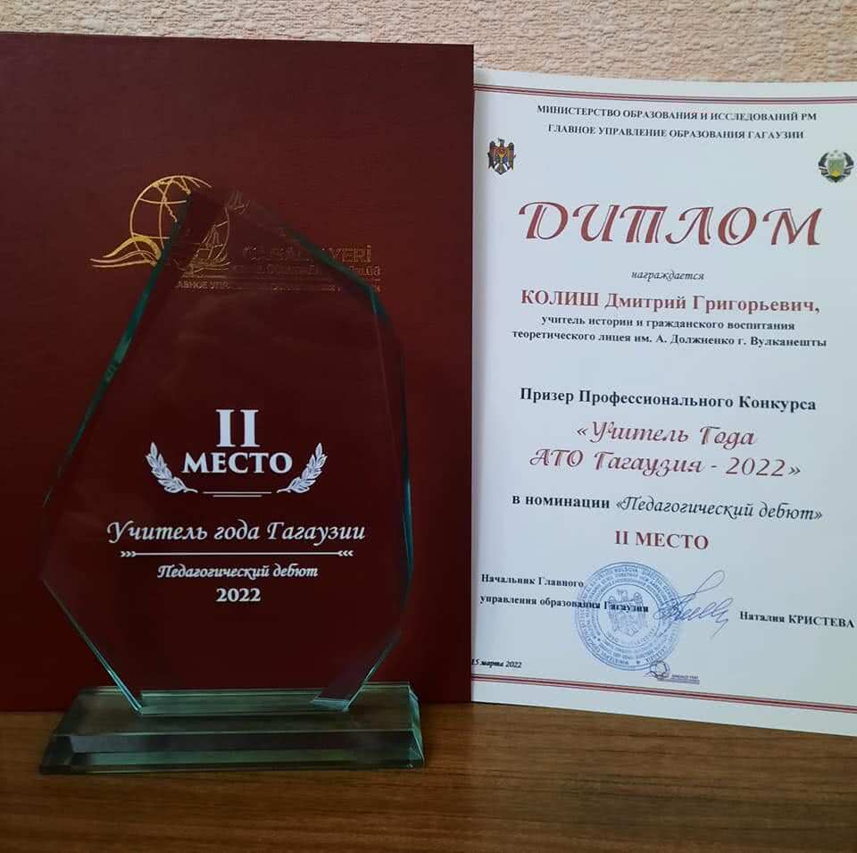 Учитель истории и гражданского воспитания теоретического лицея им. А.Должненко города Вулканешты Дмитрий Колиш занял 2-ое место в номинации «Педагогический дебют» профессионального конкурса «Учитель года АТО Гагаузия — 2022».