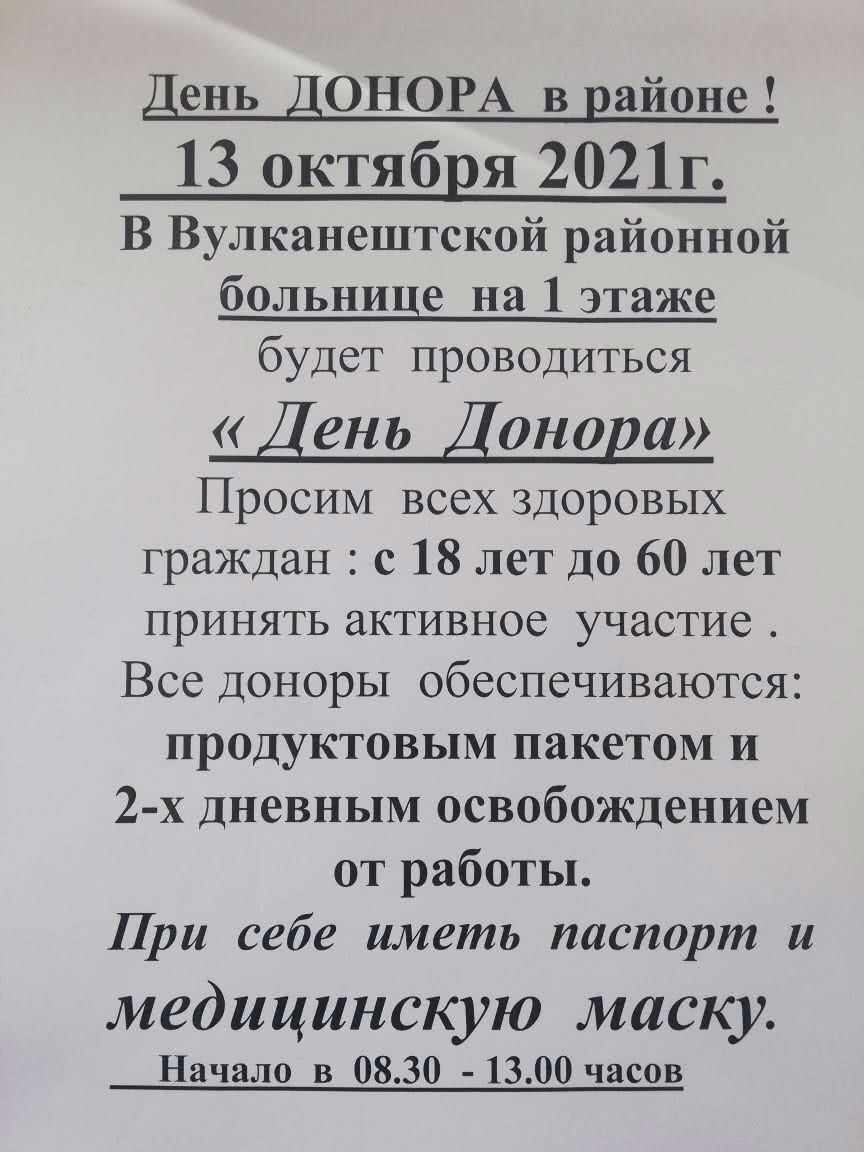 В городе Вулканешты 13 октября пройдет День Донора 11 октября, 2021 Post Navigation Предыдущая новость: В городе Вулканешты произошёл прорыв водопроводаСледующая новость: Жители Молдовы обязаны носить с собой удостоверение личности