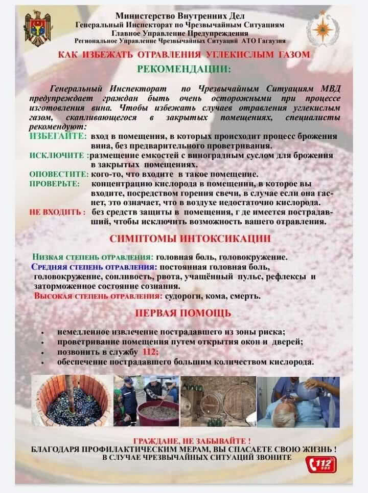 К сожалению, ежегодно осенью в Молдове, из-за несоблюдения населением правил безопасности, регистрируется не менее 3-5 смертей от отравления газом при брожении молодого вина. Чтобы беда не произошла, необходимо помнить, что при брожении виноградного сусла выделяются токсичные газы, крайне вредные для человека, вдыхая которые он может потерять сознание, а затем, если вовремя не оказать медицинскую помощь погибнуть.
