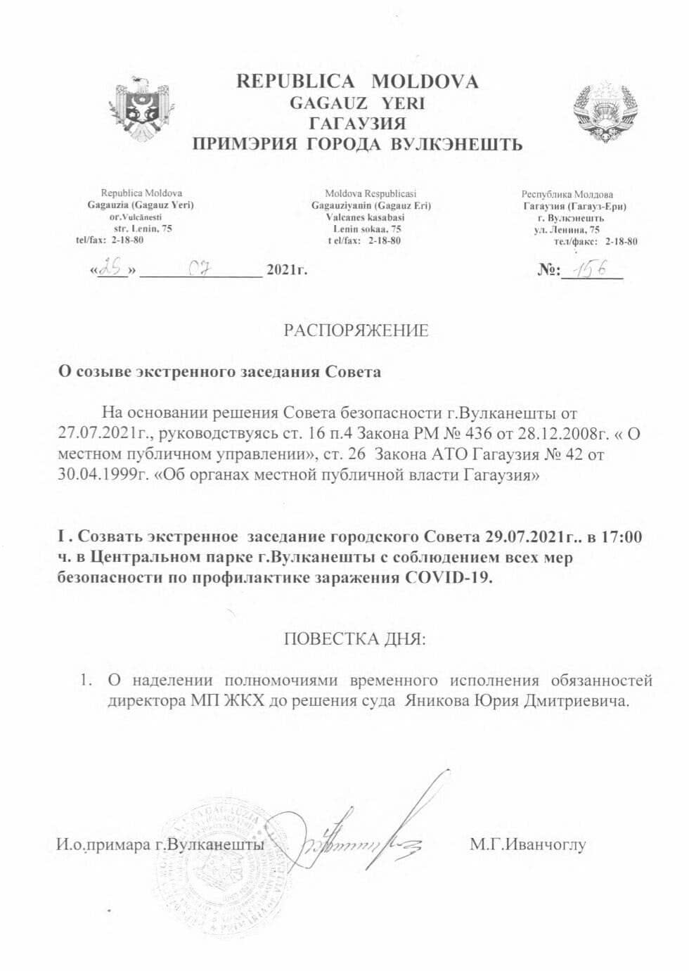На основании решения Совета безопасности г.Вулканешты от 27.07.2021г., руководствуясь ст. 16 п.4 Закона РМ №436 от 28. 12.2008 г. « О местном публичном управлении», ст. 26 Закона АТО Гагаузия № 42 от 30.04.1999г. «Об органах местной публичной власти Гагаузия»