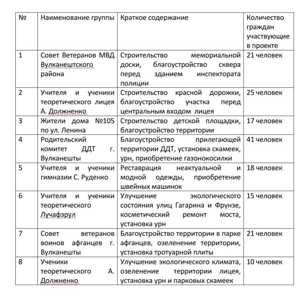 Городским Советом г. Вулканешты в бюджете на 2021 год, были предусмотрены 50 тысяч лей, на партисипативное бюджетирование, т.е. по 10.000 лей на каждый проект.