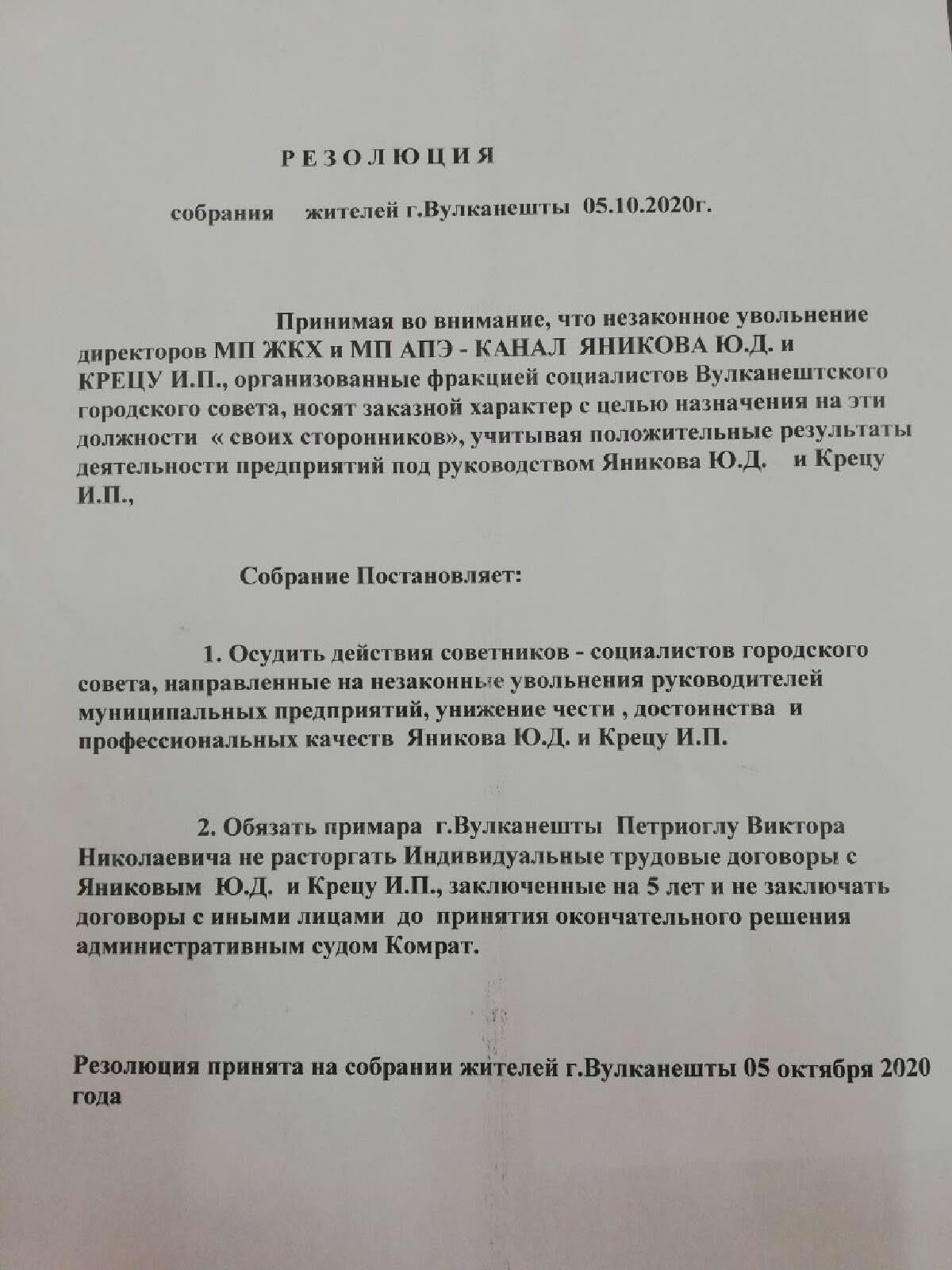 В городе Вулканешты, сегодня, 5 октября 2020 года, состоялась акция протеста коллективов ЖКХ и «APA — CANAL» против незаконного увольнения директоров муниципальных предприятий, организованных фракцией социалистов городского Совета.