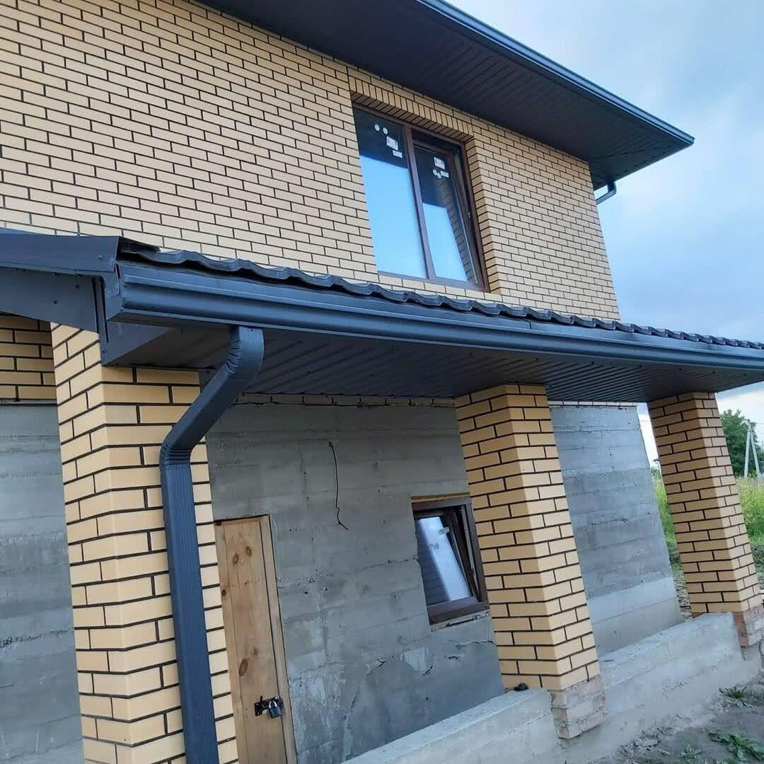 Установка водосточных желобов без швов, также подшивка фронтонов, обвесов, козырьков.