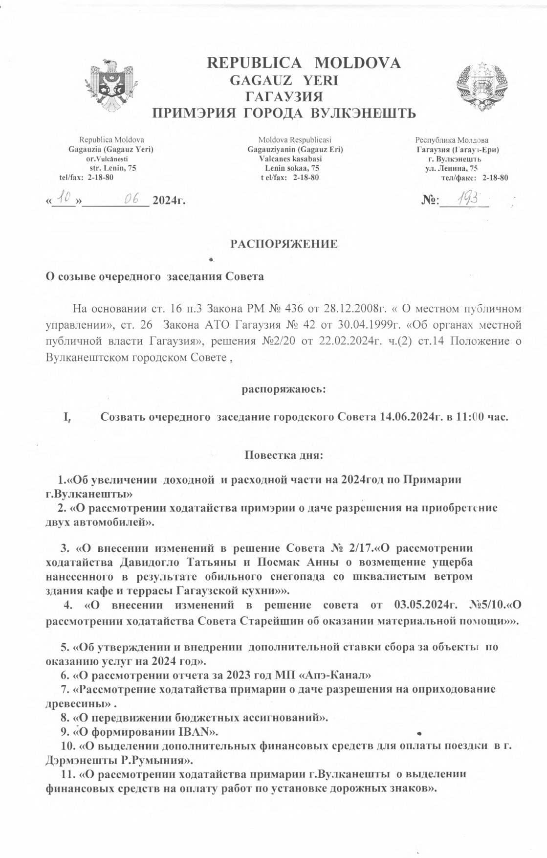 Распоряжение о созыве очередного заседания Городского совета 11 июня, 2024 Очередное заседание Городского совета состоится в пятницу, 14 июня, в 11:00 Post Navigation Предыдущая новость: Синоптики объявили желтый код: ливень и град возможны на территории ГагаузииСледующая новость: Примария города поздравила Митиш Евгению Пантелеевну с 80-летием