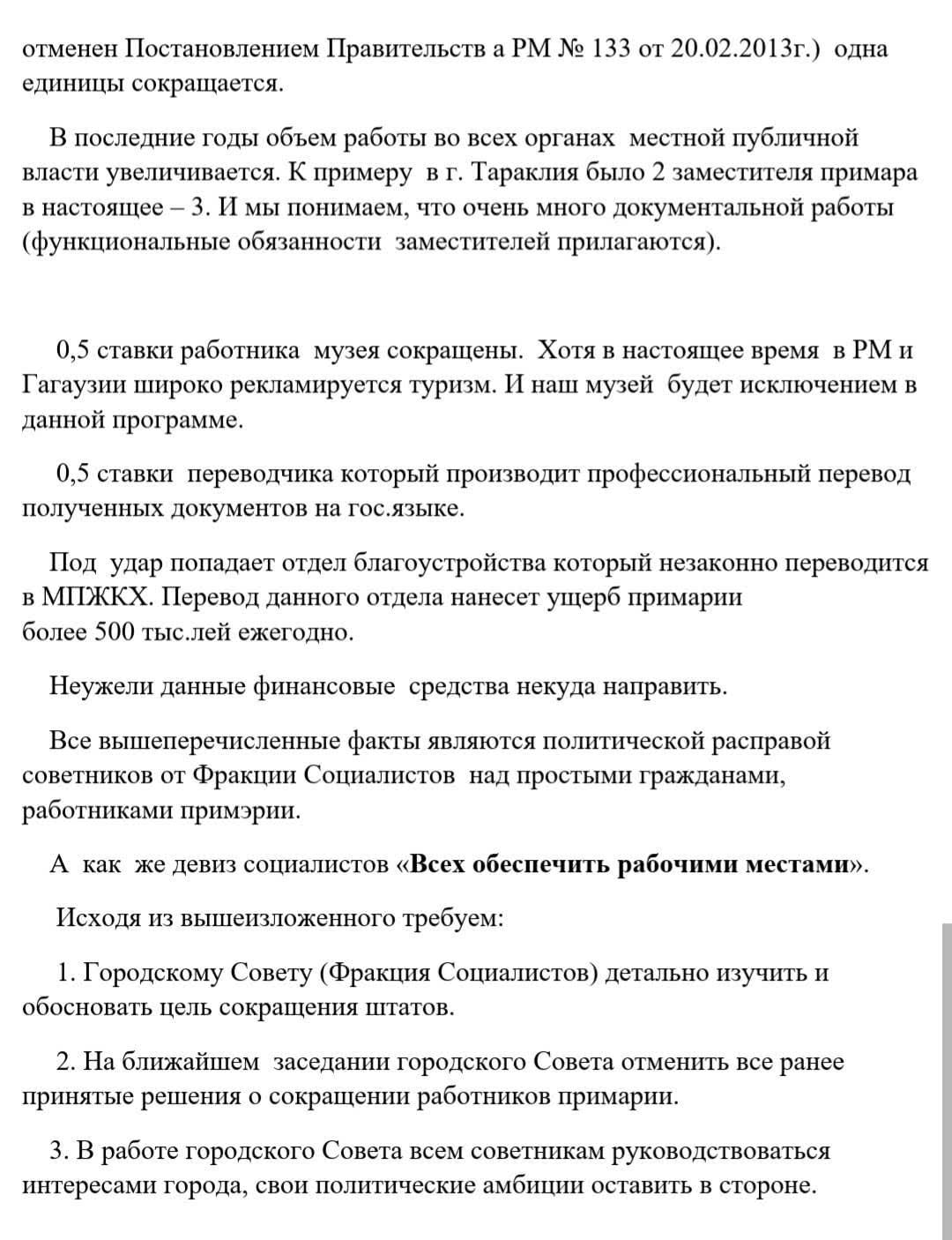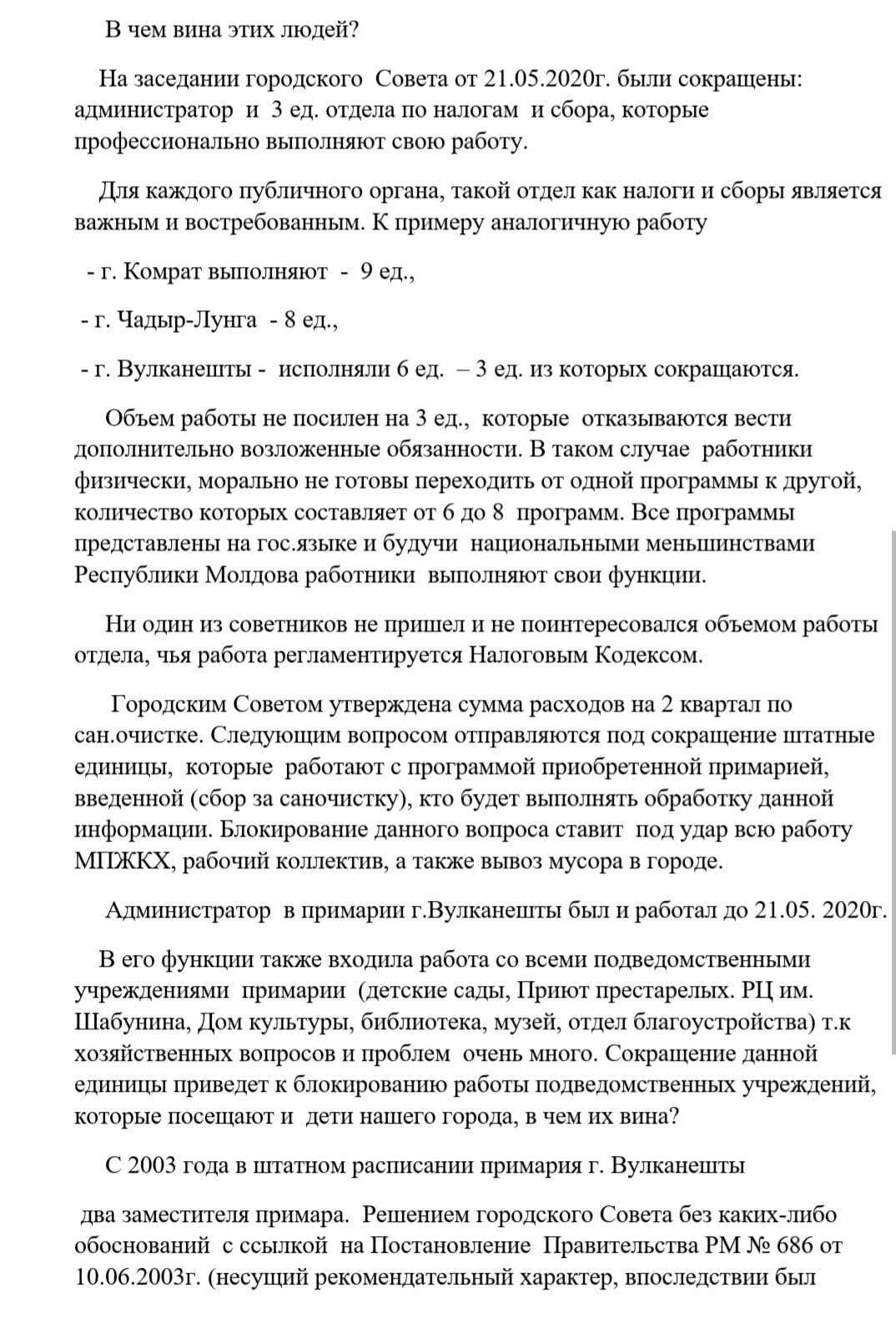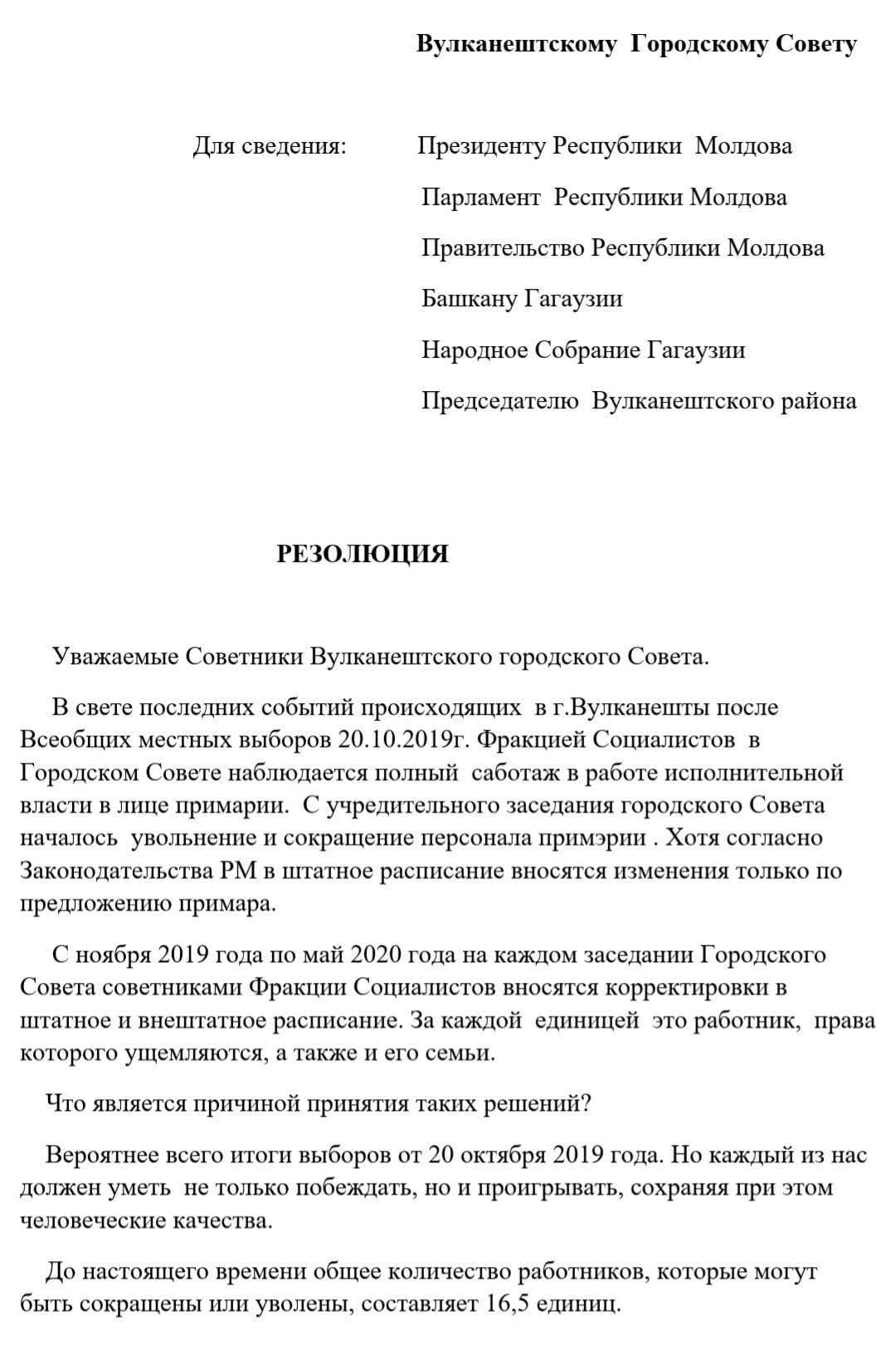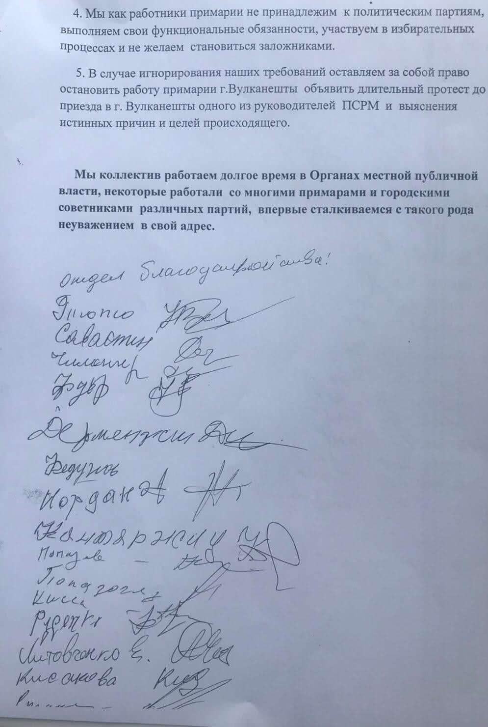 Коллектив примарии города Вулканешты после вчерашней акции протеста принял резолюцию