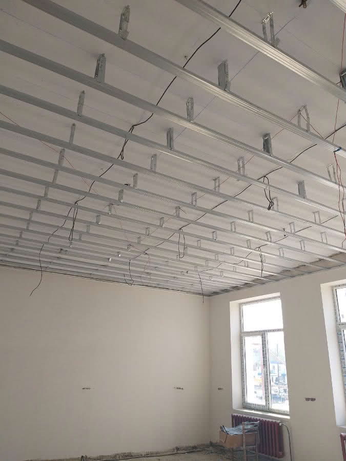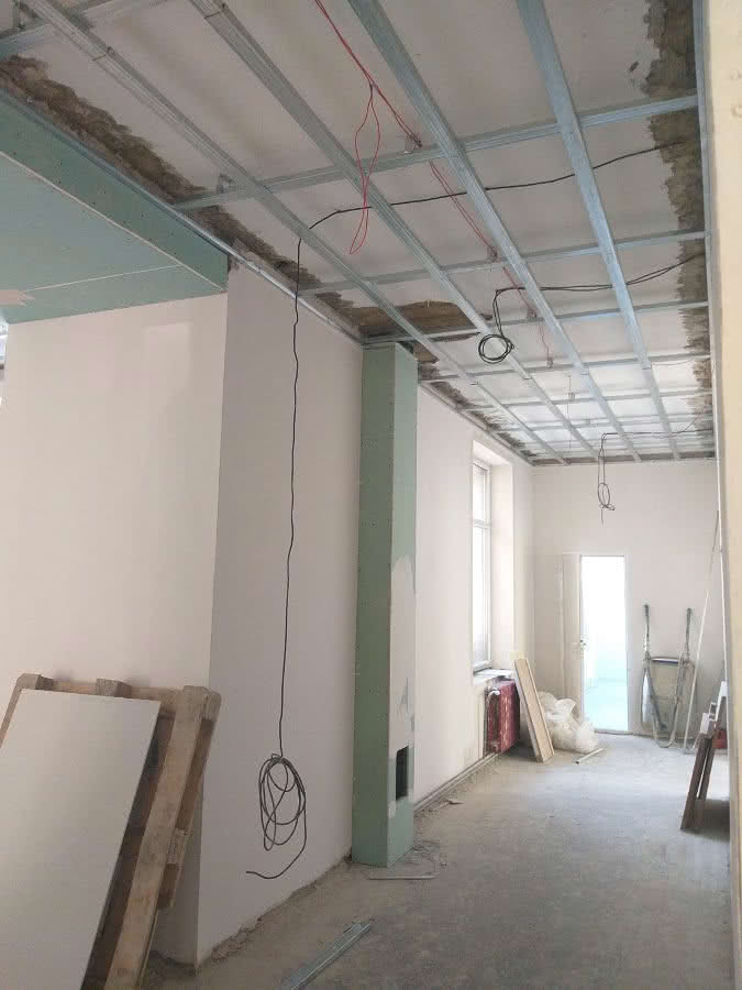 Кроме этого строители соорудили каркасы для навесных потолков, заштукатурили стены, осталось только завершить работу финишной шпатлевкой.