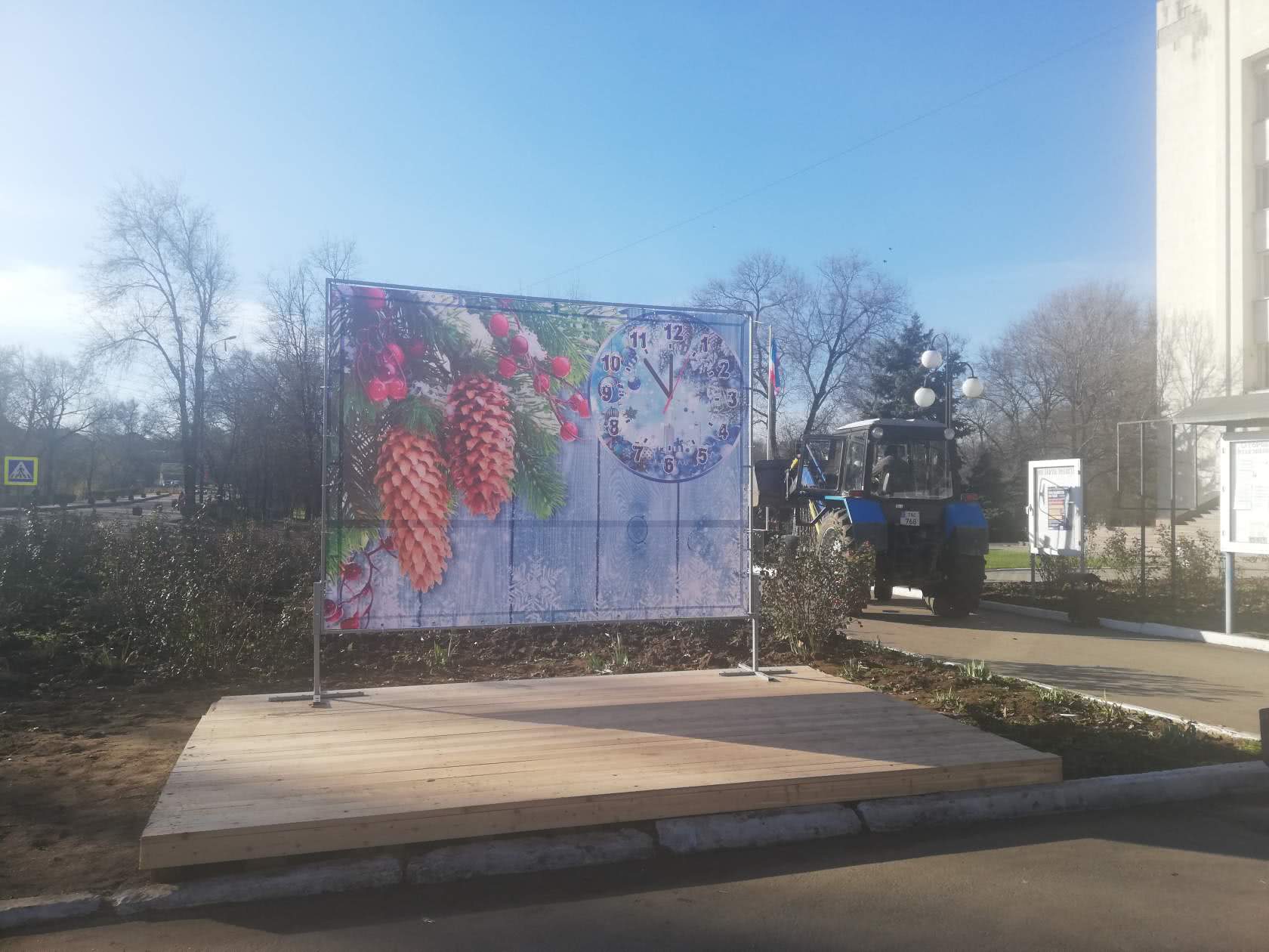 Работники отдела благоустройства устанавливают праздничную иллюминацию и фото-зону.