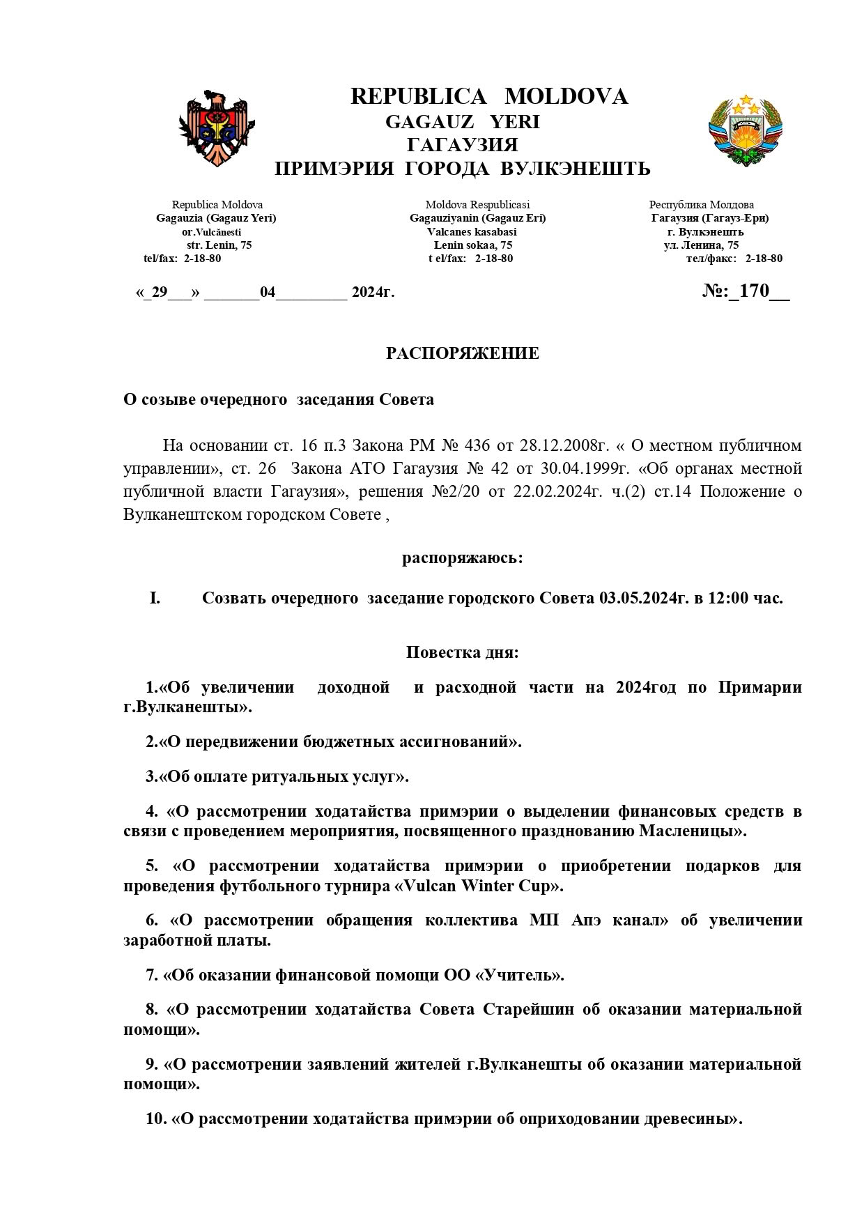 Распоряжение о созыве очередного заседания Городского совета 29 апреля, 2024 Очередное заседание Городского совета состоится в пятницу, 3 мая, в 12:00 Post Navigation Предыдущая новость: Premier Energy предупреждает об отключении электроэнергии во вторник, 30 апреляСледующая новость: Первое Мая — Праздник Весны и Труда