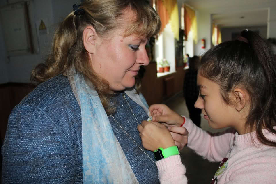 Без внимания не остались и учителя. Ребята цепляли им эмблемы, дарили фрукты и призывали к ЗОЖ.