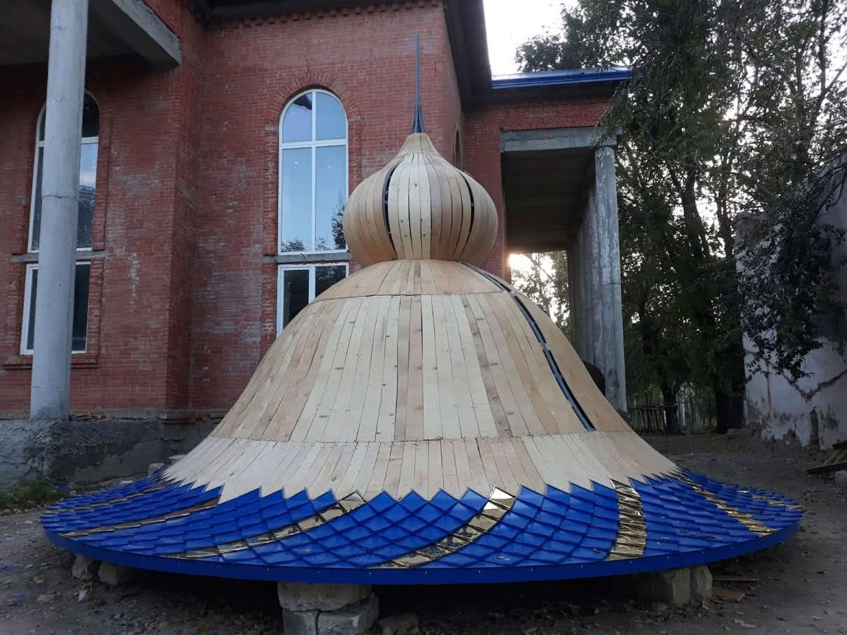 К данному моменту уже возведены стены, на территории храма бригада собирает купол для будущей часовни.