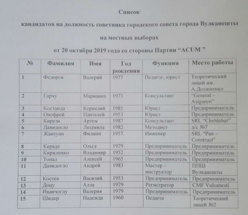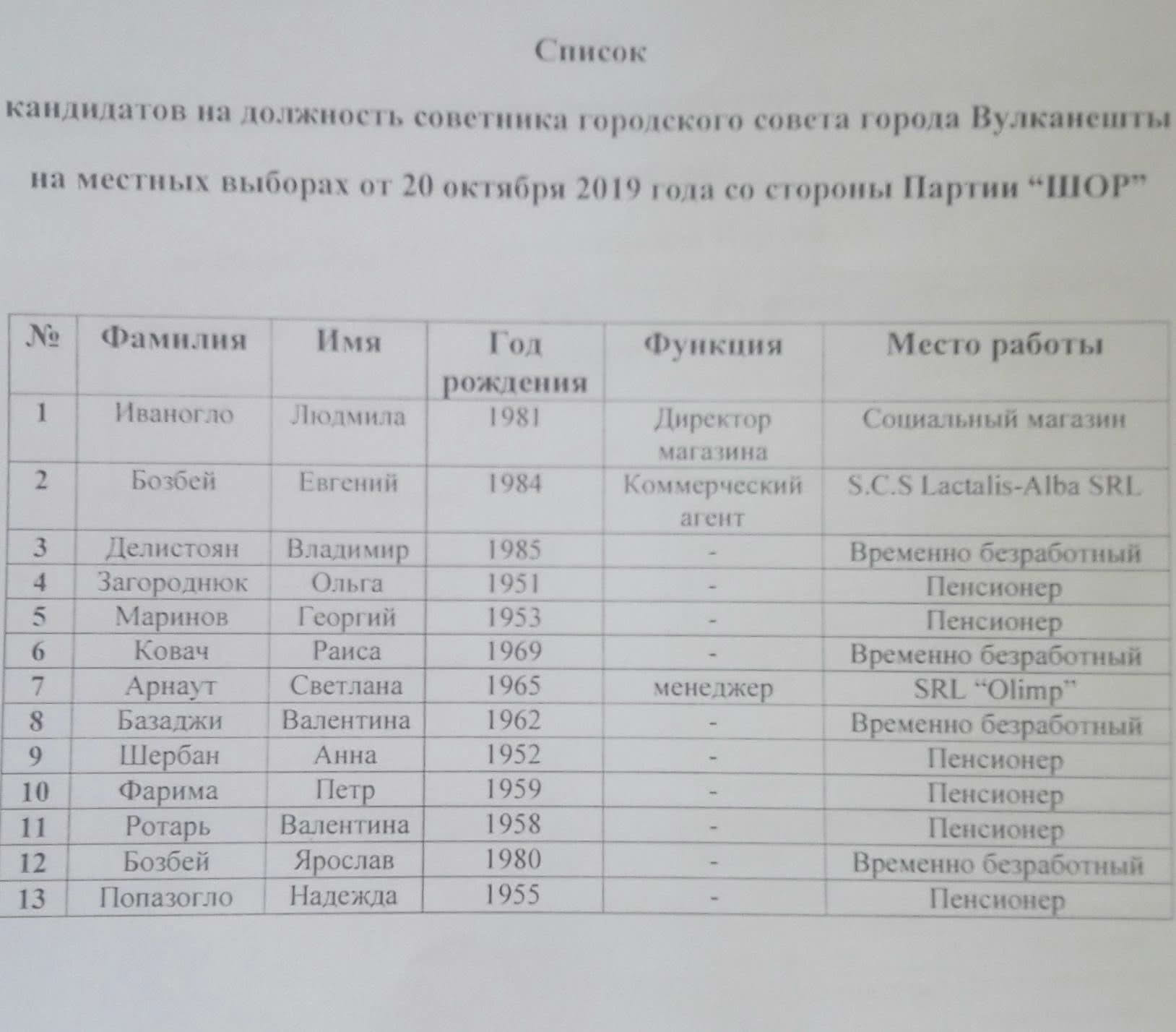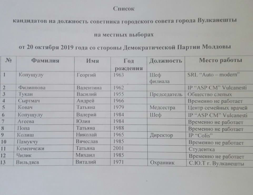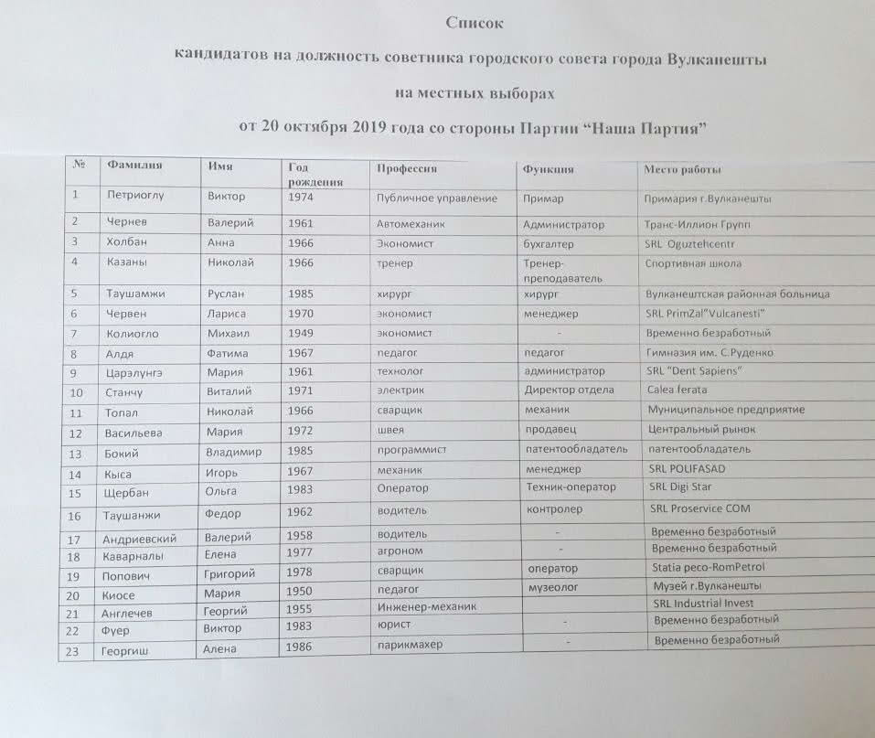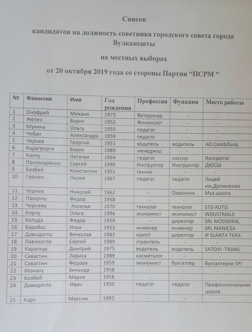 Списки зарегистрированных кандидатов на должность примара и советников города Вулканешты