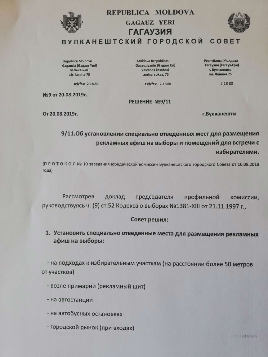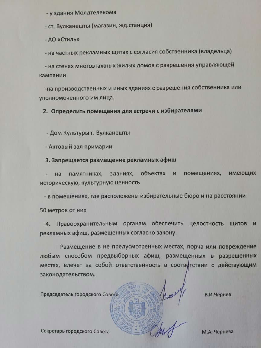 На городском Совете города Вулканешты были определены специально отведенные места для размещения рекламных афиш на выборы и помещения для встречи с избирателями.