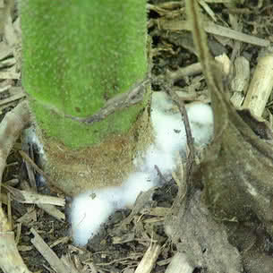 Симптомы: у всходов загнивают семядоли, подсемядольное колено, корни, всходы гибнут. Позднее у молодых и взрослых растений поражаются зоны корневой шейки, стеблей на разной высоте. Образуются мокнущие загнивающие пятна бурого цвета с белым ватообразным налетом, которые, разрастаясь, окольцовывают зону корневой шейки или стебель. На поверхности и внутри пораженных участков — крупные черные склероции.