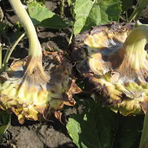 Симптомы: ткани буреют и покрываются пушистым серым налетом, на котором формируются мелкие черные склероции. На обратной стороне корзинок появляется темное маслянистое пятно, ткань размягчается и покрывается обильным серым налетом. Оболочки семян становятся рыхлыми и как бы мраморными. При этой болезни подсолнуха на поверхности семян и внутри них образуются склероции.