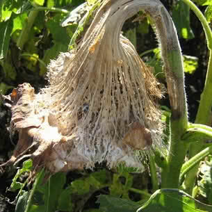 при влажной погоде во второй половине лета патоген локально проникает в завязи, рост растений приостанавливается, развитие корзинок продолжается, зародыш отмирает и семянка остается пустой. Источники инфекции: мицелий в семенах и ооспоры в растительных остатках, распространяется зооспорангиями.