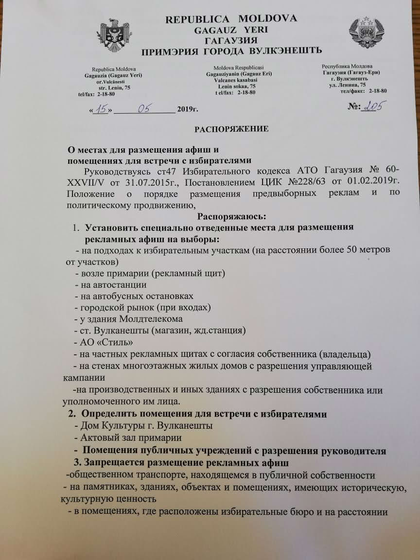 Узнай, о местах для размещения предвыборных афиш и помещениях для встречи с избирателями 23 мая, 2019 Post Navigation Предыдущая новость: Заботливые дедушки и бабушки: «Мы продолжаем осуществлять дежурство на опасных дорожных переходСледующая новость: Утверждены границы избирательных участков в городе Вулканешты