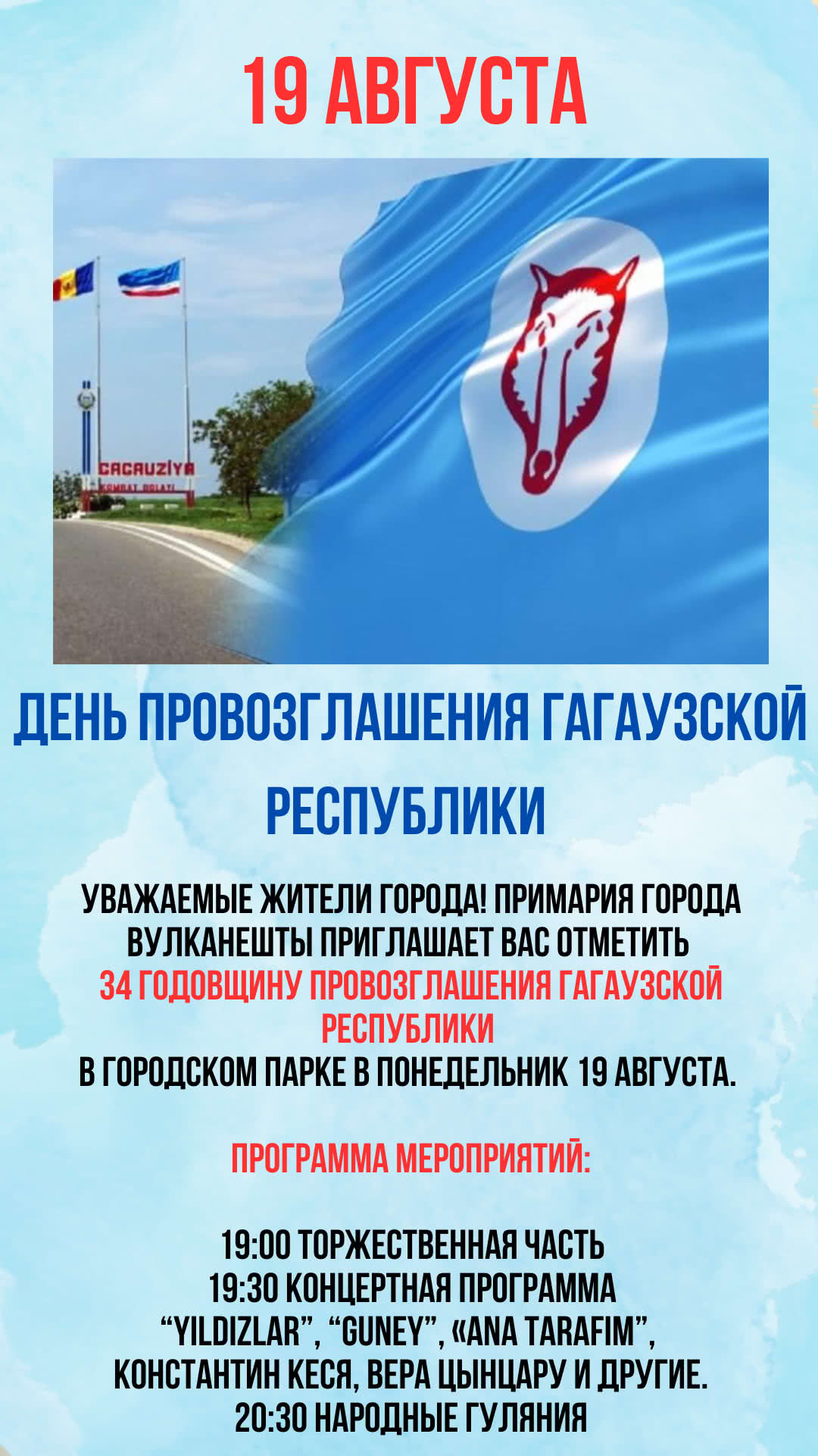 Приглашаем всех на праздничный концерт, посвященный Дню провозглашения Гагаузской Республики, который состоится в парке в 19:00.
