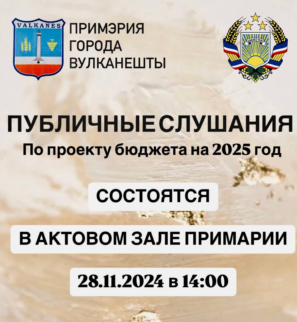 Жители города Вулканешты приглашаются на публичные слушания по проекту бюджета на 2025 год в четверг, 28 ноября 2024 года, в 14:00. Место проведения — актовый зал примарии.