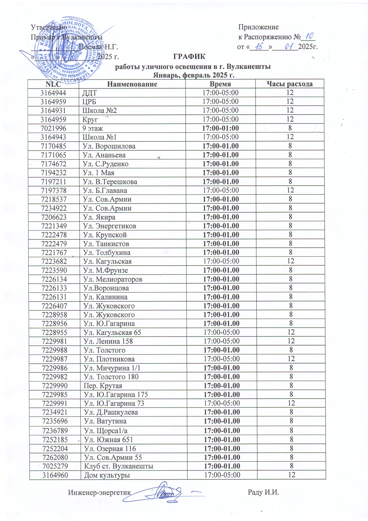 На основании Постановления Парламента №НР286/2024 и Постановления №39/1 Исполкома АТО Гагаузия в связи с введением режима Чрезвычайной Ситуации примарией города Вулканешты был разработан план мероприятий в зимний период 2024-2025. Одним из пунктов является введение графика работы уличного освещения на январь-февраль 2025 г., представленный ниже.