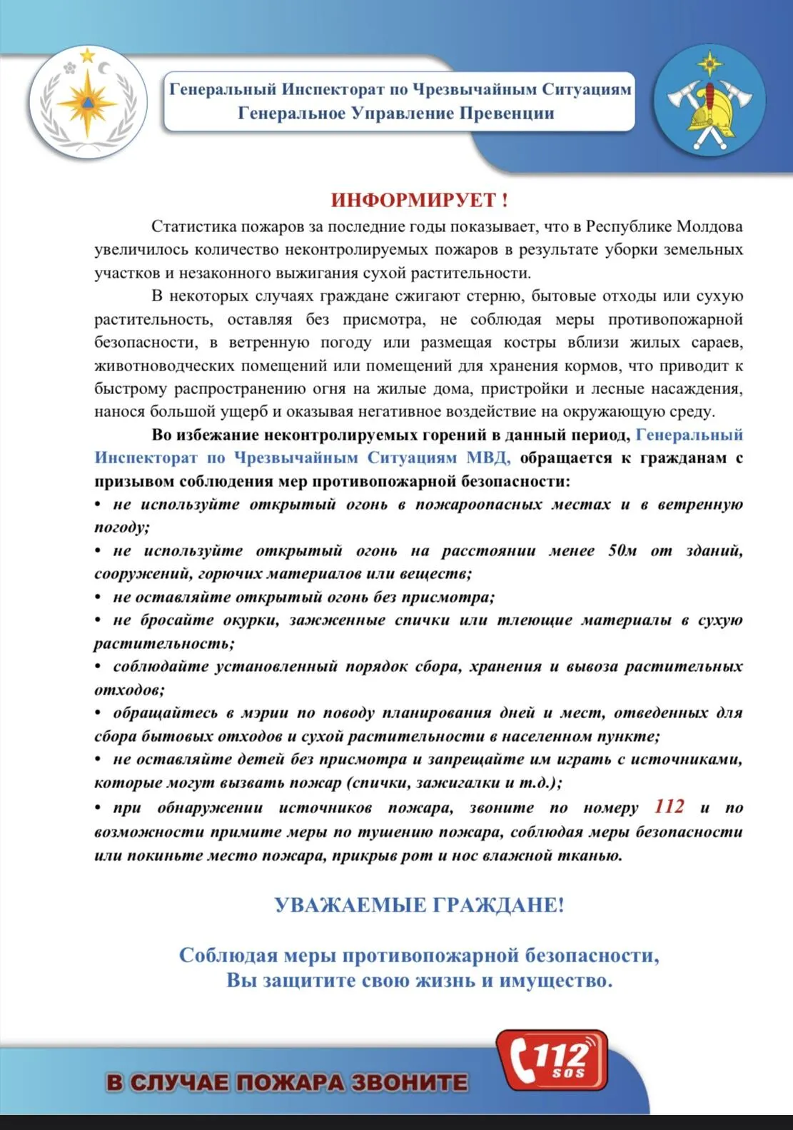 Генеральный Инспекторат по Чрезвычайным Ситуациям Генеральное Управление Превенции ИНФОРМИРУЕТ: 14 февраля, 2024 Post Navigation Предыдущая новость: Независимый центр «Expert-Grup» при поддержке Посольства Нидерландов в Кишиневе объявляет о запуске программы поддержки молодых предпринимателей из Республики Молдова «Бизнес-инкубатор TulipСледующая новость: «Артист года»: Ансамбль из города Вулканешты получил награду за большой вклад в дело развития и сохранения народного творчества