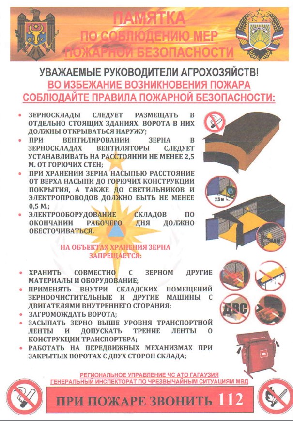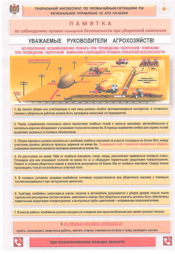 Отдел Чрезвычайных Ситуаций г. Вулканешты обращается к руководителям аграрных хозяйств с настоятельной рекомендацией соблюдать меры противопожарной безопасности в период уборки урожая и заготовки кормов.