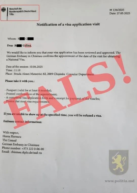 Полиция Республики Молдова сообщает о ряде случаев мошенничества, в результате которых пострадавшие граждане понесли материальные убытки, оплатив услуги неизвестной компании, обещавшей содействие в получении виз и трудоустройстве в Германии.