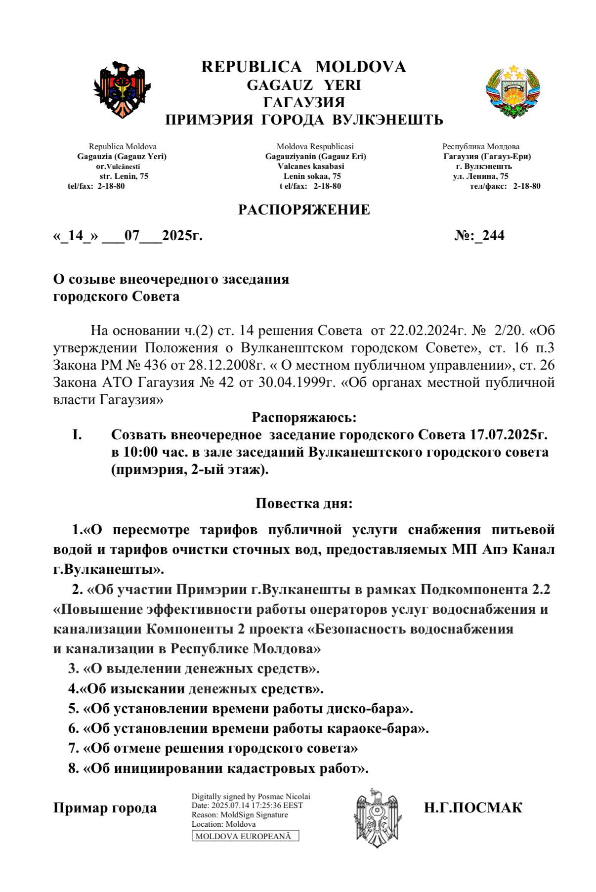 Согласно распоряжению примара, внеочередное заседание Городского совета состоится в четверг, 17 июля 2025 г., в 10:00.