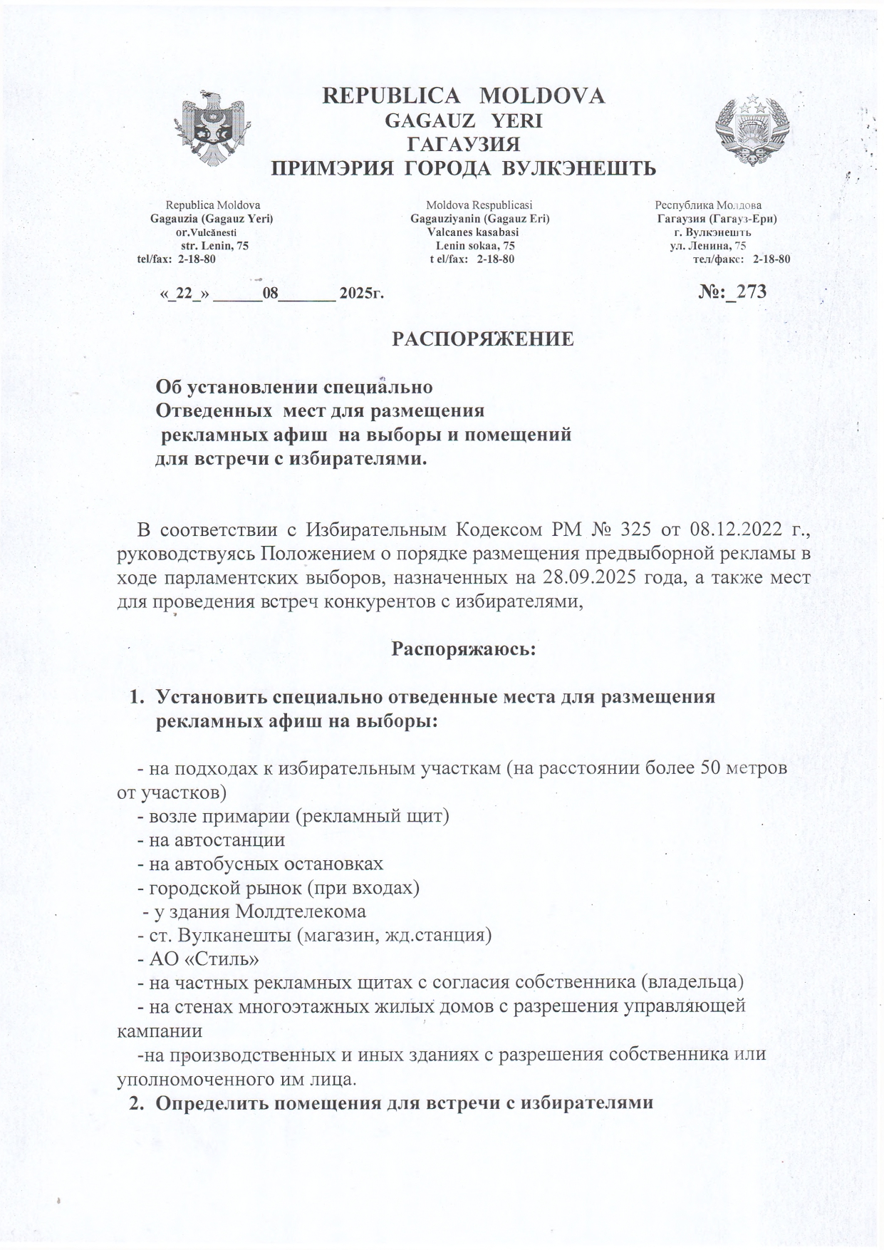 В соответствии с Избирательным Кодексом РМ № 325 от 08.12.2022 г., руководствуясь Положением о порядке размещения предвыборной рекламы в ходе парламентских выборов, назначенных на 28.09.2025 года, были установлены ь специально отведенные места для размещения рекламных афиш на выборы и определены помещения для встречи с избирателями