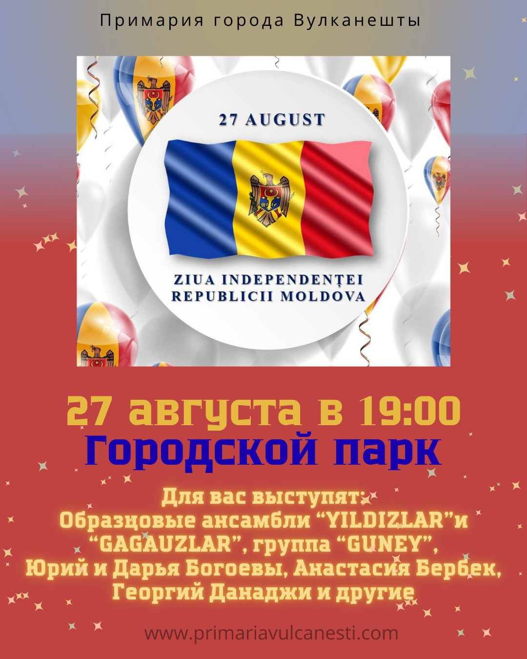 Уважаемые жители и гости города! Примария города Вулканешты и Городской совет приглашают вас принять участие в праздновании Дня Независимости Республики Молдова, которое состоится 27 августа в городском парке.